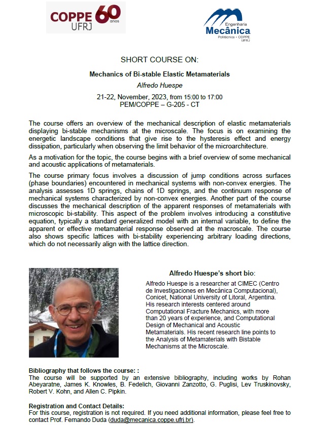 This short course delves into the mechanical aspects of elastic metamaterials that exhibit bi-stable mechanisms at the microscale. It aims to provide a comprehensive understanding of the energetic landscape conditions that lead to phenomena such as hysteresis effect and energy dissipation, especially in the context of the limit behavior of microarchitectures. presented by esteemed researcher Alfredo Huespe. This course is scheduled for November 21st and 22nd, 2023, from 15:00 to 17:00 at location G-205, PEM, COPPE.